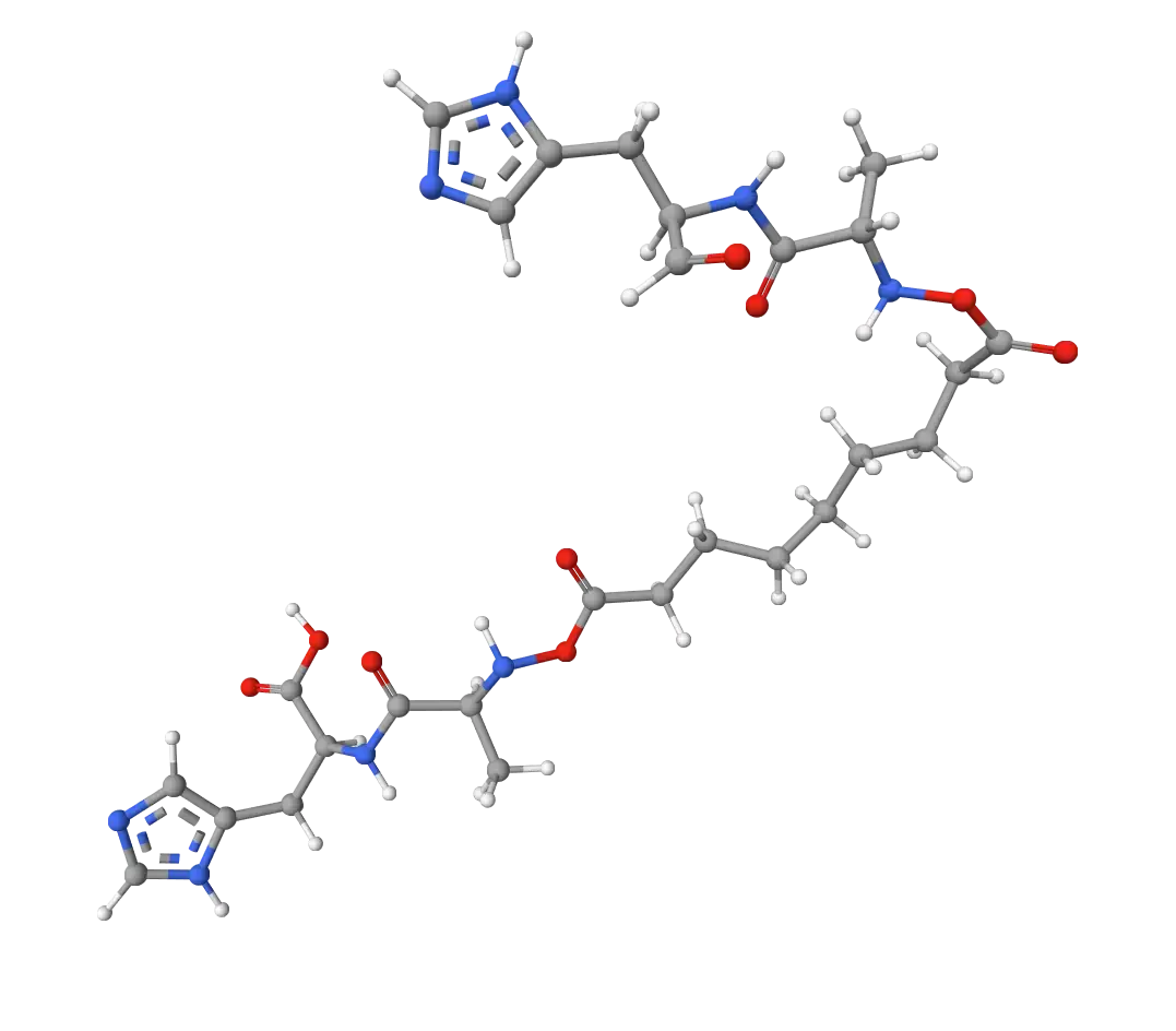 Thanks to the presence of two dipeptide molecules, Ala-His, the whole molecule can be considered a tetrapeptide that inhibits the glycation of skin proteins and promotes cell renewal. Glycation of ECM (extracellular matrix) proteins (like collagen) is one of the aging processes in the skin that impairs the structure, distribution, and function of fibers. The molecular structure of Azelaoyl Bis-Dipeptide-10 prevents the binding of sugars to proteins (glycation), inhibiting the formation of AGEs and preserving skin firmness and elasticity.